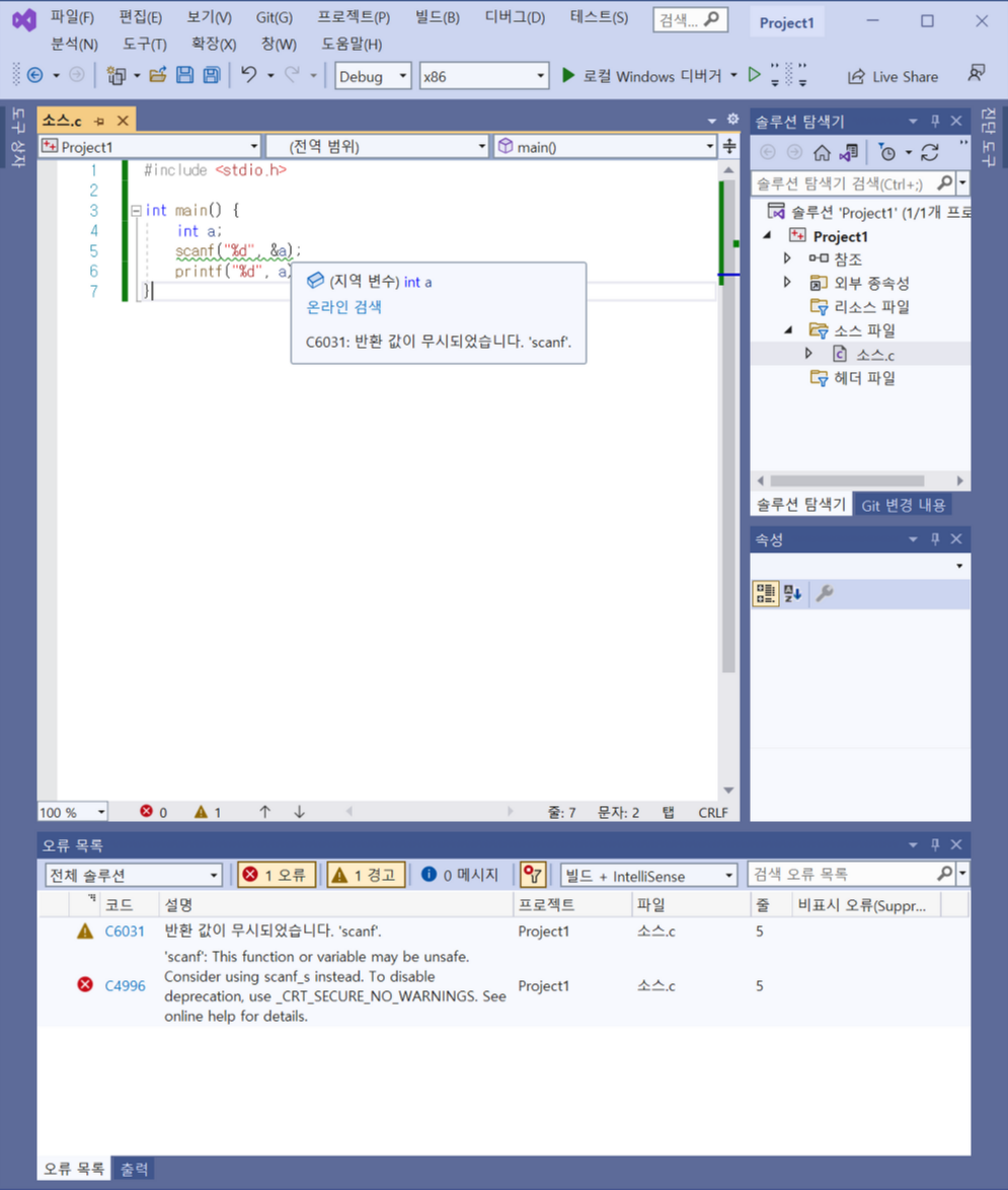 하지만 전 코드 새로 짤때마다 이걸 붙여놓는것도 일이라 생각해서 scanf_s로 짜줄겁니다.