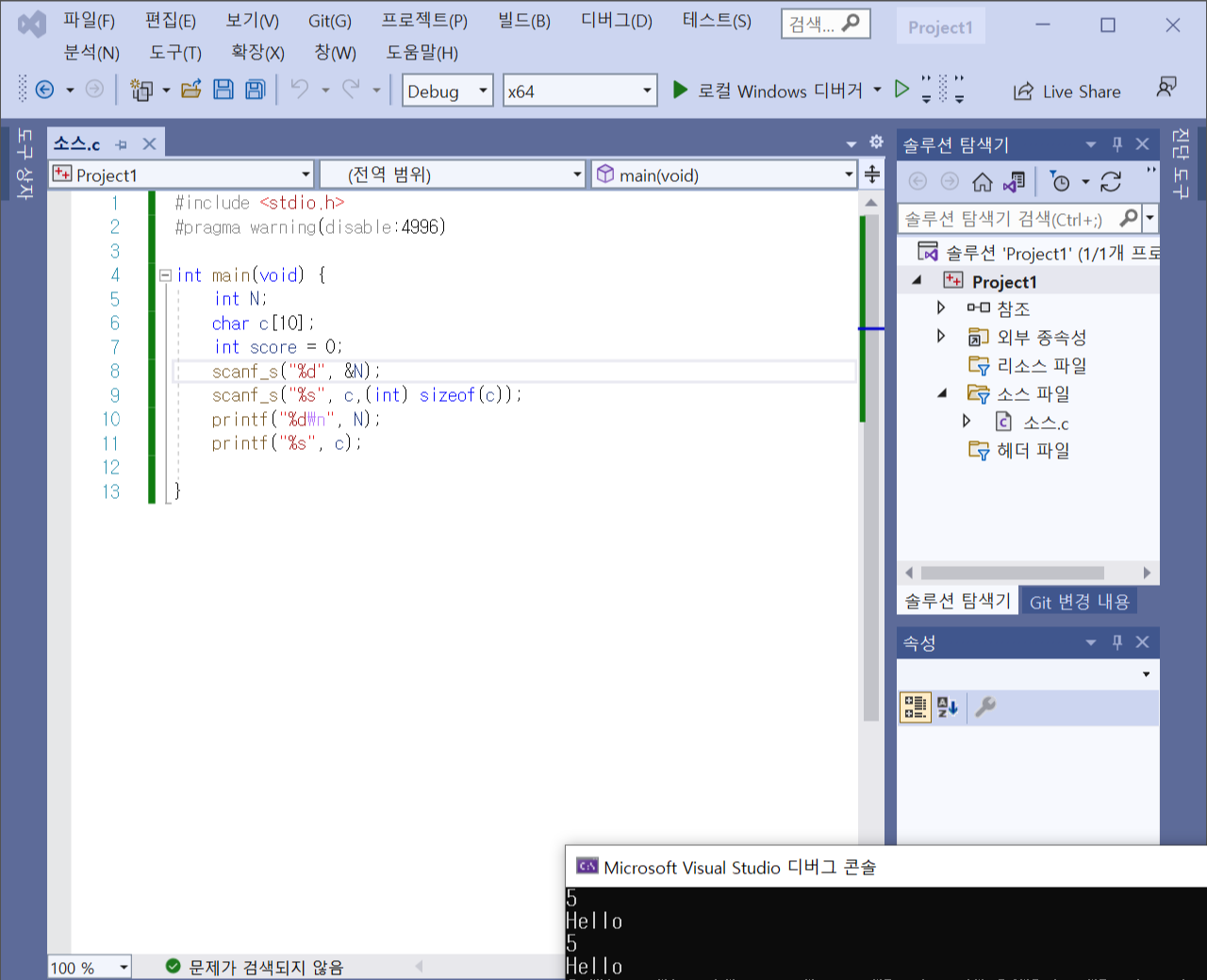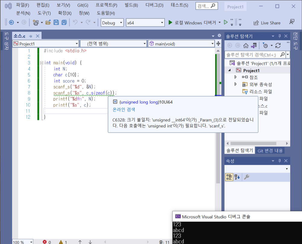 일반적으로 처음 비주얼 스튜디오를 설치하고 scanf_s를 사용하면 초록색 줄이 생깁니다