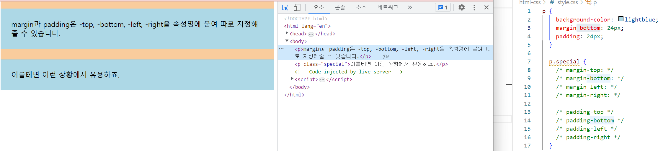 이번엔 margin-botton만 지정해 줬는데 위에도 들어간 모습을 볼 수 있다(주황색)!!