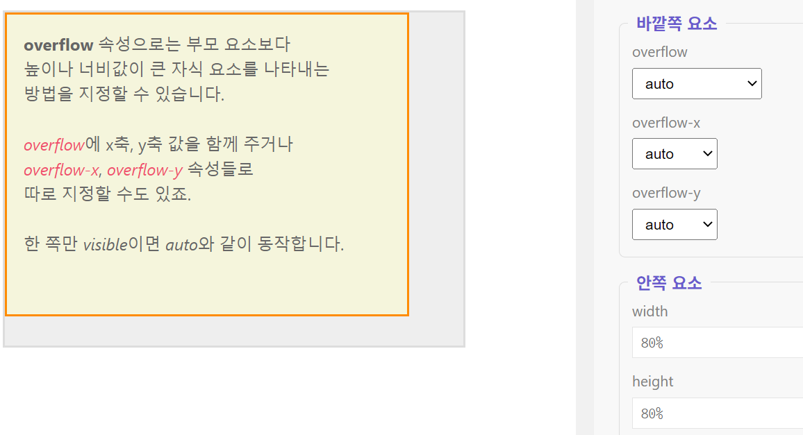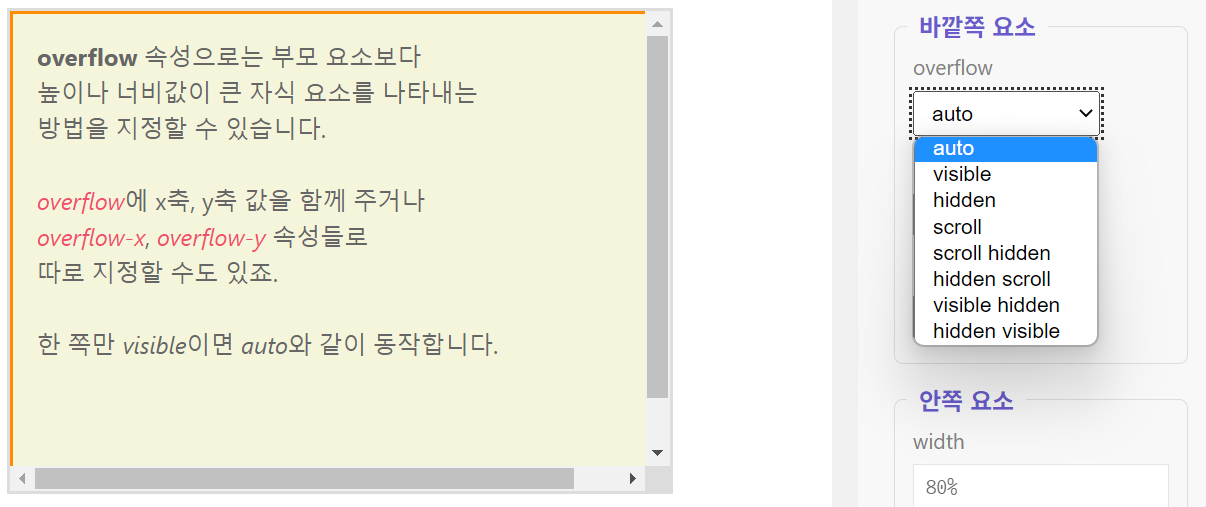 이렇게 스크롤이 나타나는 게 기본 값인데 스크롤을 없애거나(hidden), 칸을 강제로 늘릴(visible) 수 있다.