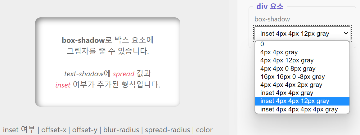 안쪽 그림자 | 기본 오른쪽 | 기본 아래 | 블러 효과 | 그림자 크기 | 색상