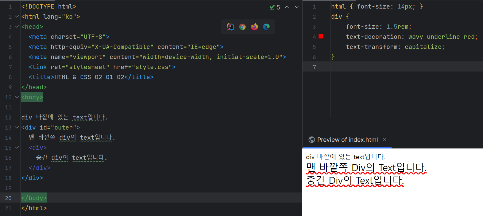 위에 css를 넣으면 안에 있는 div는 중복 적용돼서 글자 크기가 2배씩 커진다.