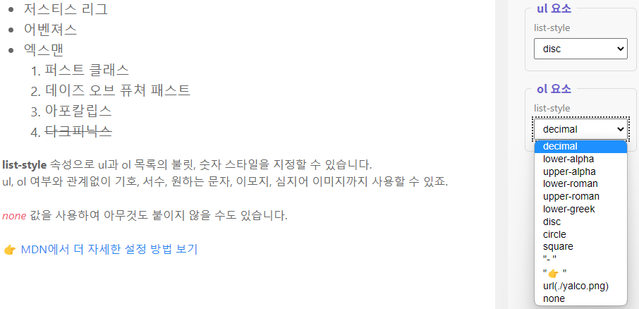 list-style : 리스트의 요소 디자인을 바꿀 수 있다. 이모티콘, 그림, 사진도 넣을 수 있다.