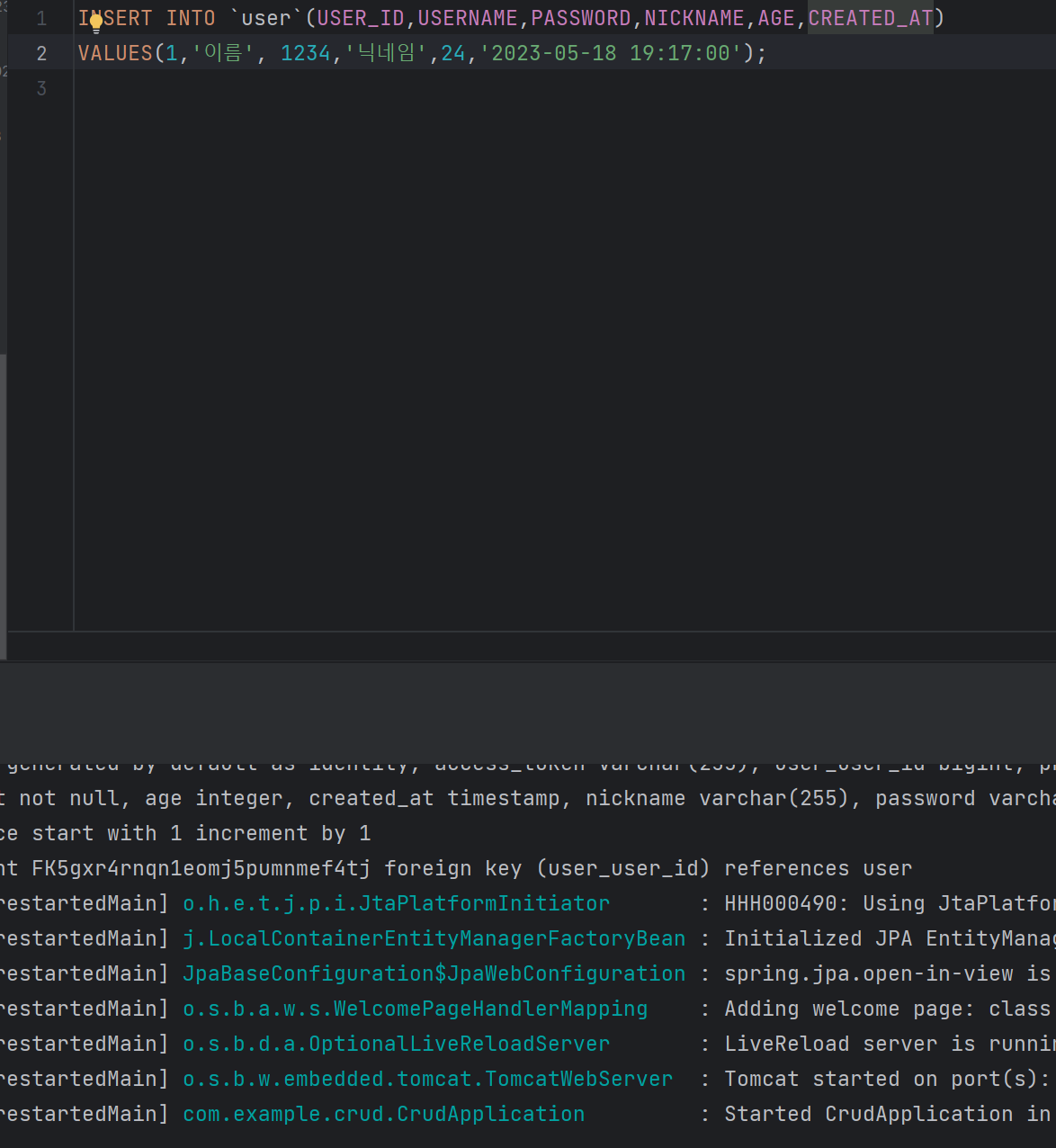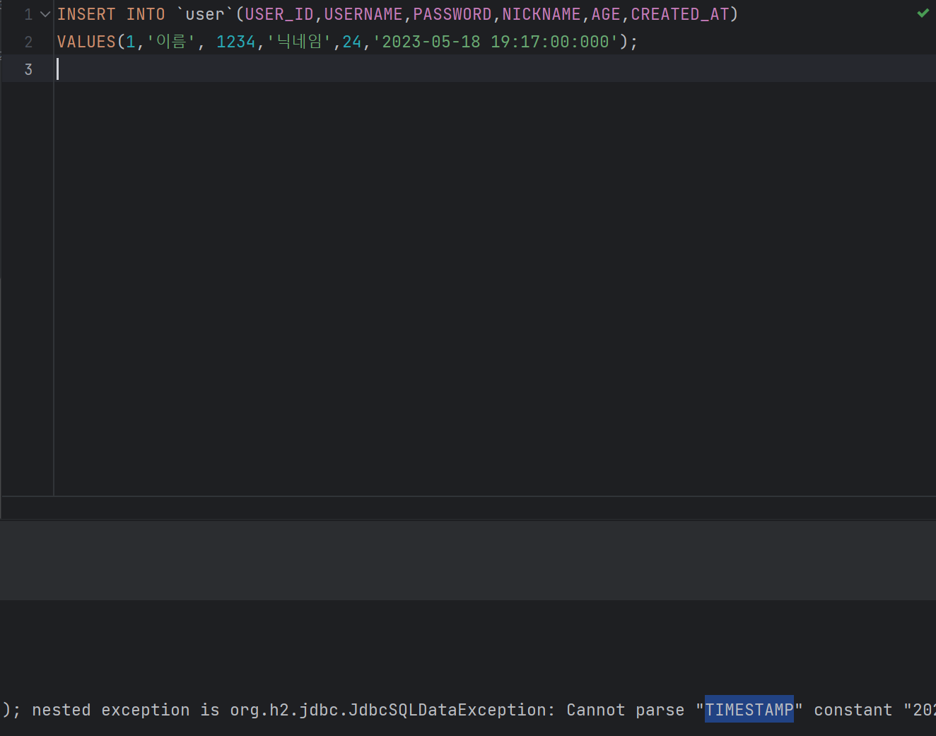 INSERT INTO `user`(USER_ID,USERNAME,PASSWORD,NICKNAME,AGE,CREATEAT) VALUES(1,'이름', 1234,'닉네임',24,'2023-05-18 19:17:00:000') [22007-214]