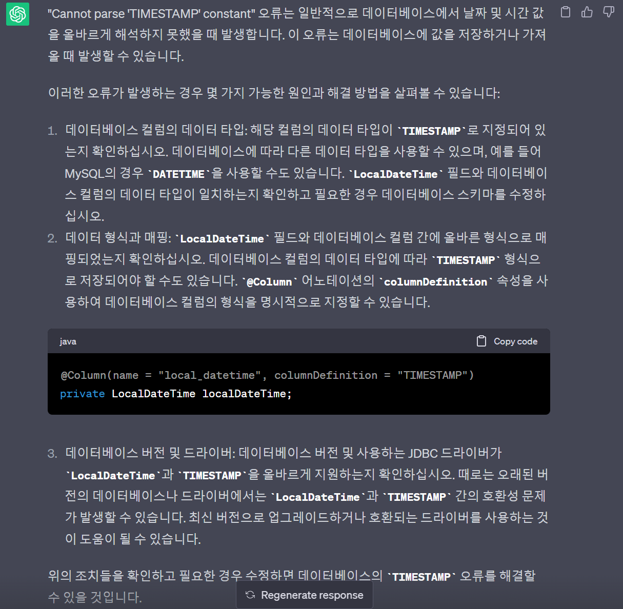 gpt 말로는 columnDefinition = "TIMESTAMP" 추가하라고 하는데 내 경우에는 이래도 해결이 안 됐다.